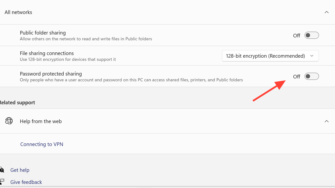 Expand All networks. If you prefer that anyone on the local network can open the shared folders without entering a username and password, turn off Password protected sharing. If you want stricter control, leave it on and be ready to enter account credentials when connecting from other devices.