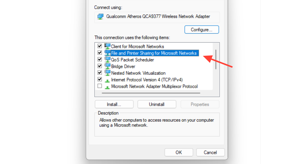 Right‑click your active network connection (Wi‑Fi or Ethernet) and choose Properties. In the list in the middle, make sure File and Printer Sharing for Microsoft Networks is checked. If it is not, tick it and click OK so that the PC can share folders and printers.
