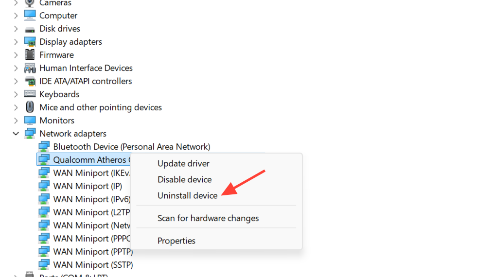 Right‑click the same adapter again and select Uninstall device. Confirm the removal. Then restart the PC; Windows will reinstall the adapter automatically with a fresh configuration, which can clear persistent driver‑level issues that affect networking tools.