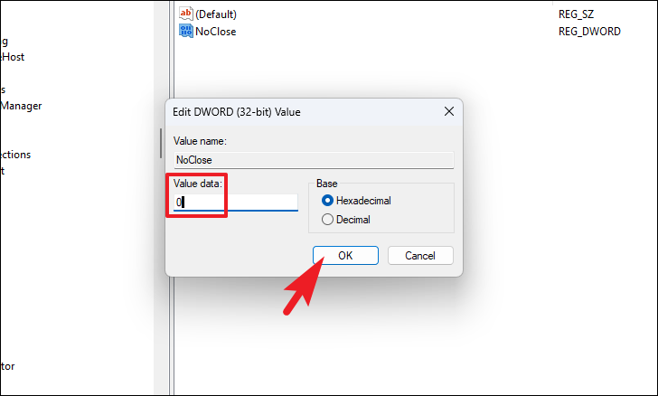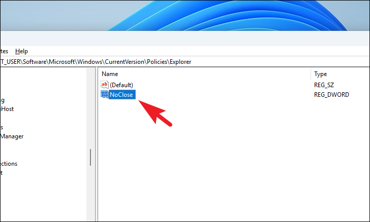 Then, on the right section of the screen, double-click on the 'NoClose' registry.
