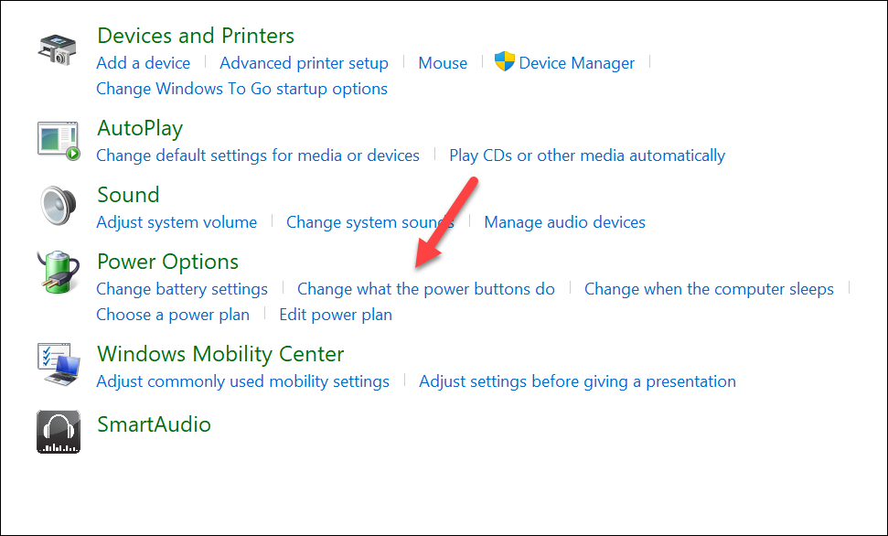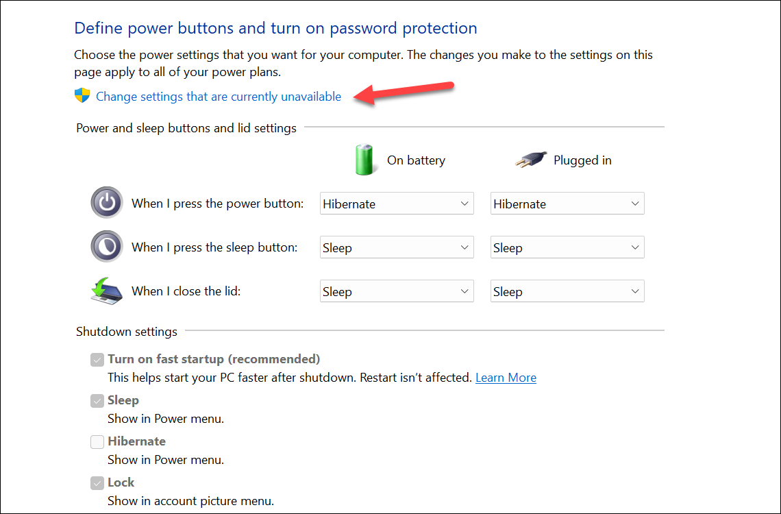 Go to 'Power Options' and click the 'Change what the Power Options Do' setting.