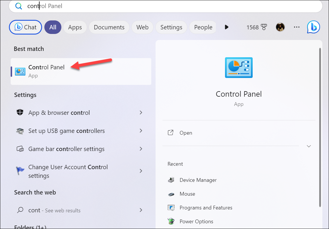 Head to the Start Menu and type 'Control.' Then, click on the 'Control Panel' tile from the search results to proceed.