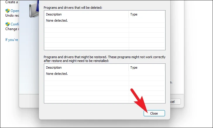 On the new window, you can view the programs that will be deleted and the ones that will be restored (since no programs will be affected on the test PC, the list in the screenshot below is empty). Click on the 'Close' button to navigate to the previous window.