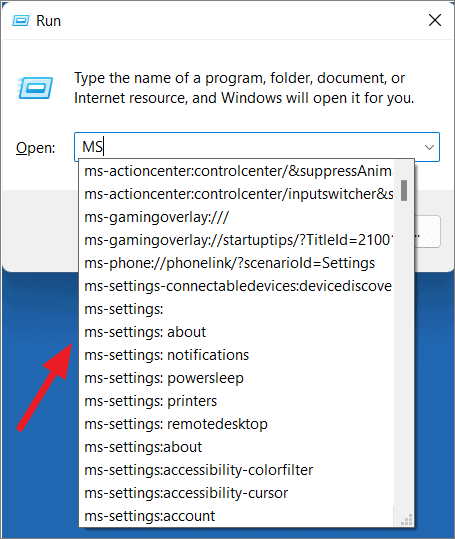 Like your web browser, the Run box stores the history of all the commands that you ever typed in the box. Whenever you open the Run command box and type the first letter of a command in the ‘Open:’ field, it will auto-suggest all the matching commands that you ever typed in a drop-down menu (as shown below).