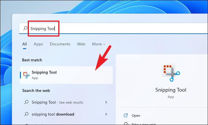 To take a delayed screenshot using the Snipping Tool, head to the Start Menu and type Snipping Tool. Then, from the search results, click on the ‘Snipping Tool’ tile to open the app.