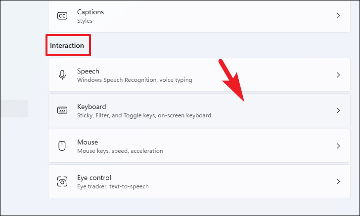 After that, from the right section of the window, scroll down to locate and click on the ‘Keyboard’ tile present under the ‘Interaction’ section to proceed.