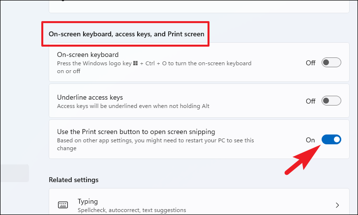Next, locate the ‘Use the Print screen button to open screen snipping’ tile present under the ‘On-screen keyboard, access keys, and Print screen’ section and click on the toggle switch present on the far right edge of the tile to bring it to the ‘On’ position.