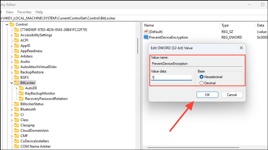 - Name the value 'PreventDeviceEncryption' and double-click on it. In the value field, enter 1 and then click on the 'OK' button. Close the Registry Editor.