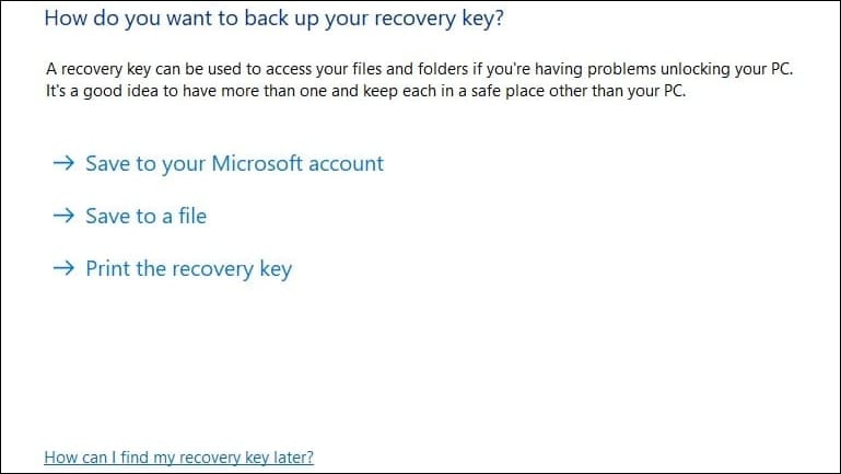 Device Encryption relies on BitLocker to encrypt files, which means you need to save your BitLocker key to a USB drive or Microsoft account. You will not be able to access your data if the key is misplaced.