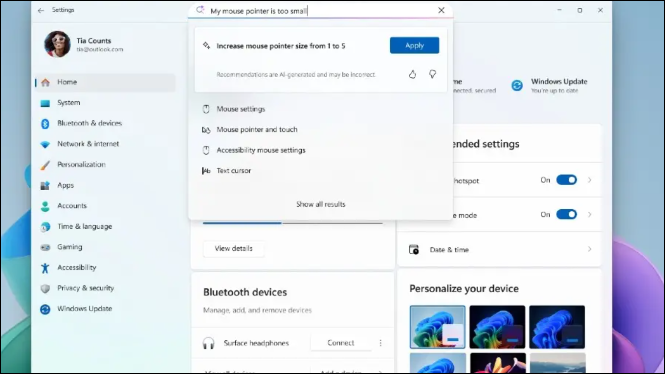 - With user approval, the agent applies the adjustment—such as resizing the mouse pointer, enabling voice control, or toggling accessibility features—without requiring the user to navigate deeper into menus.
