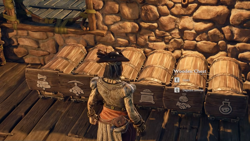 Pressing Q near a container performs a quick-drop, dumping matching items into the chest without opening the inventory screen. Combined with labeled chests, this keeps hoarding manageable as your base grows.