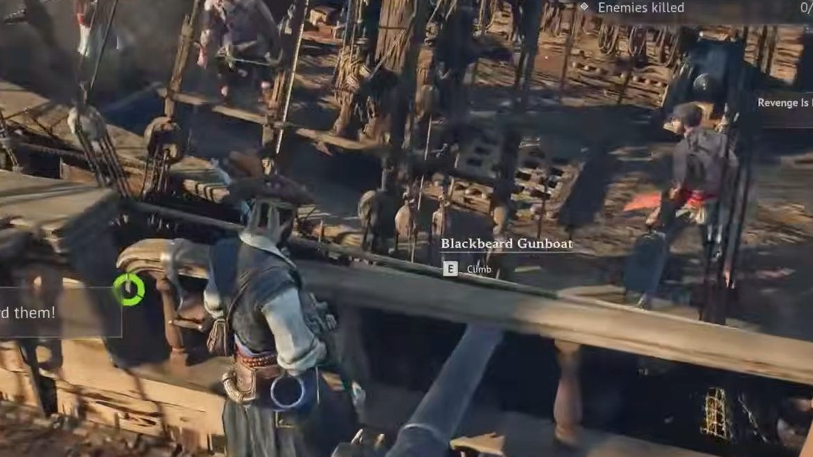 You cannot start a boarding action at full health on a moving ship. First, you have to damage the enemy vessel with cannon fire until it enters a disabled state. Your crew then throws grappling hooks and pulls the two ships together, creating a narrow bridge you cross on foot.