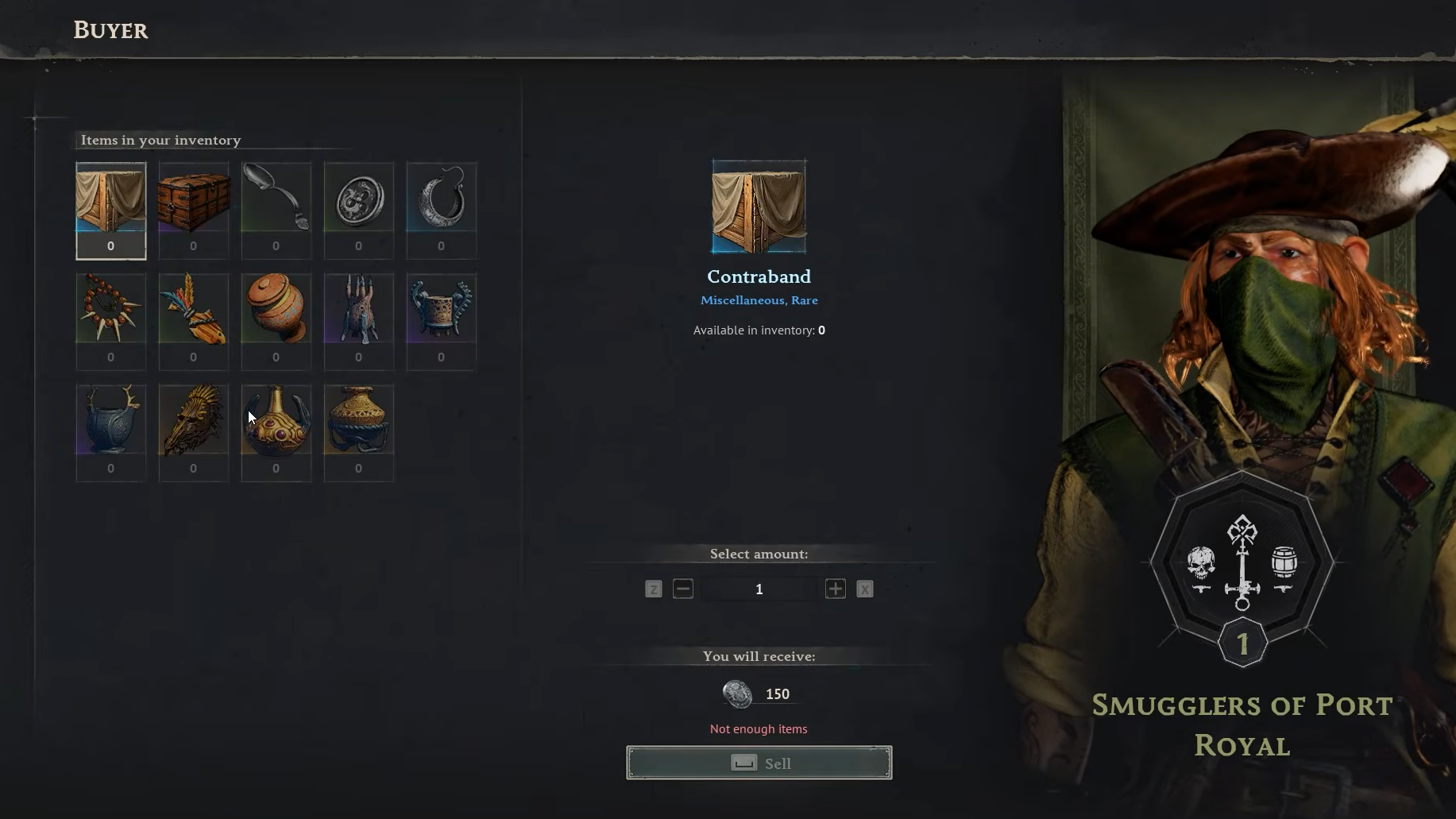 Spirits, munitions, and animal trophy buyer at the Rogue Buccaneers Main Base