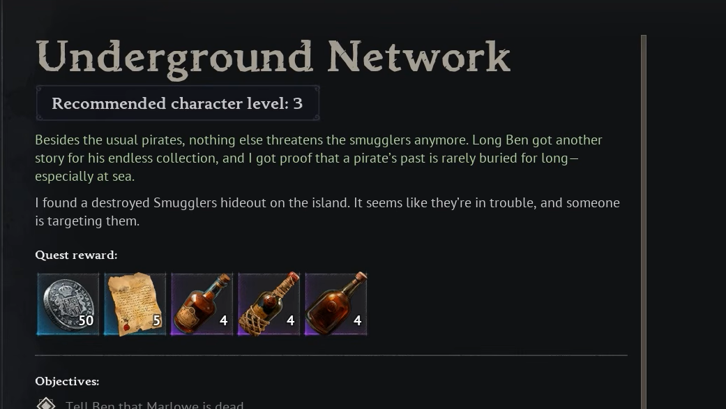 Step 3: Continue the quest chain into the "Underground Network" follow-up quest. The second objective here directs you to talk to Marita. Her cave location is the Smugglers of Port Royal Main Base, where the treasure buyer stands.