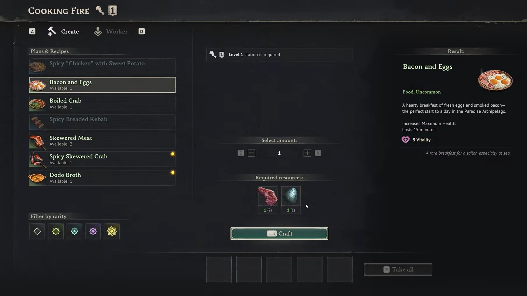 Bacon and Eggs is an uncommon dish that provides +5 Vitality for 15 minutes. The recipe is simple: 1x Meat and 1x Dodo Egg, cooked at a Level 1 Cooking Fire. Both ingredients are available almost immediately after the tutorial. This makes Bacon and Eggs the most accessible stat-boosting food in the game and the dish you should default to until better options open up.