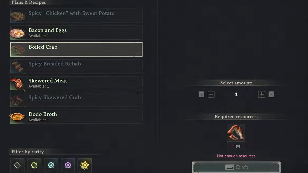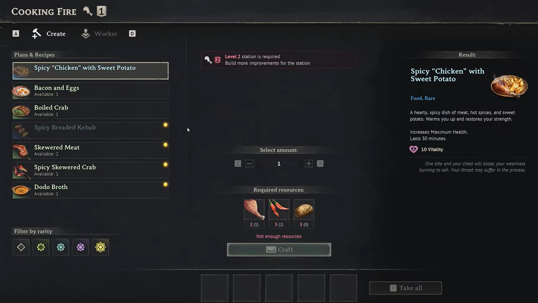 Two additional rare dishes round out the endgame cooking options. Spicy "Chicken" with Sweet Potato requires 2x Bird Meat, 5x Cayenne Pepper, and 3x Sweet Potato, granting +10 Vitality for 30 minutes at a Level 2 station. Spicy Breaded Kebab uses 2x Bird Meat, 1x Dodo Egg, and 5x Cayenne Pepper for +10 Strength over the same duration. Both are strong alternatives when you lack the specific ingredients for Seasoned Crocodile Meat or Seafood Platter, though their stat bonuses are lower at +10 compared to +20.