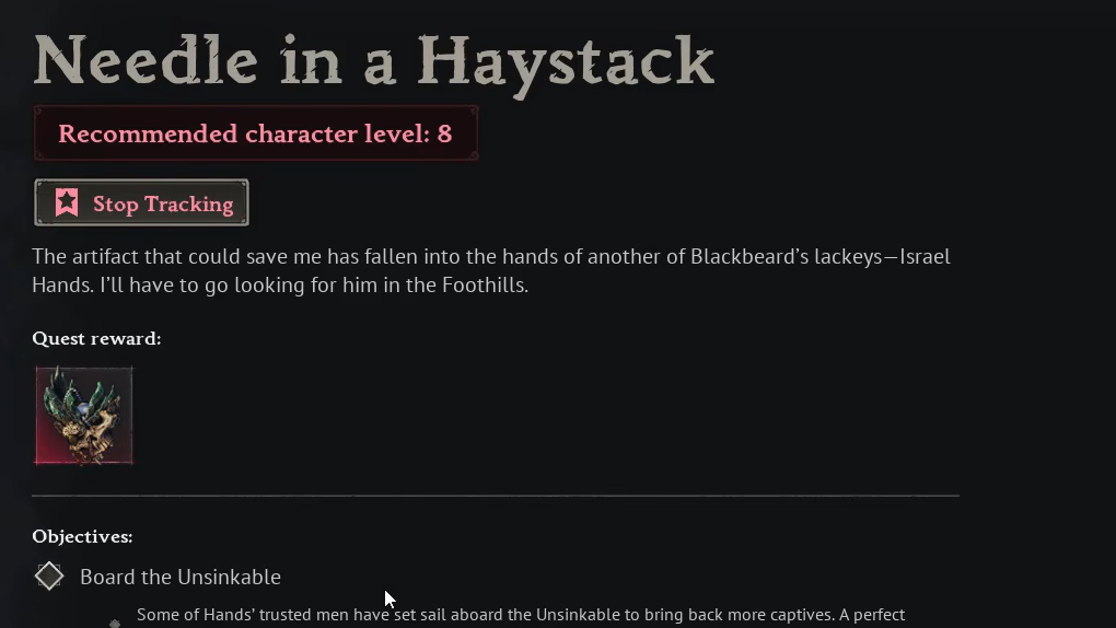 The biome's own storyline is Needle in a Haystack, which sends you through pirate camps, onto the Unsinkable, and eventually to the second boss, Israel Hands. Beating Hands unlocks Cursed Swamp exploration and Level 11+ crafting.