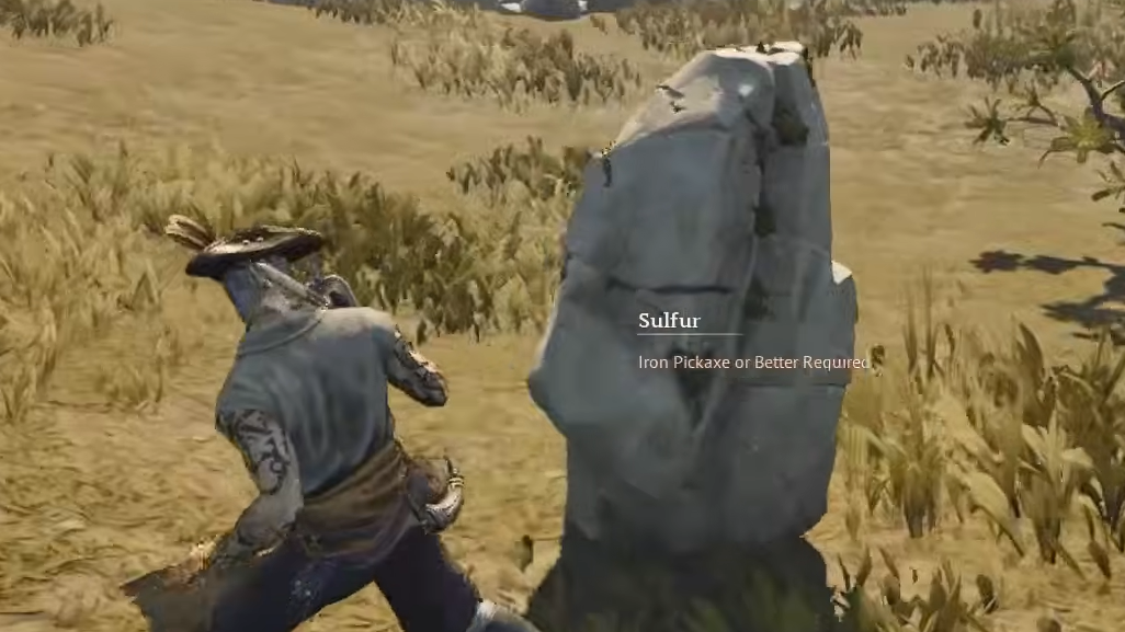 Sulfur deposits sit on rocky ridges with two or three clumps attached to the same formation. Because Sulfur unlocks Homemade Gunpowder, which also requires Corn-based Cornmeal through the Millstones chain, pairing Sulfur runs with Ancient Village detours is efficient.