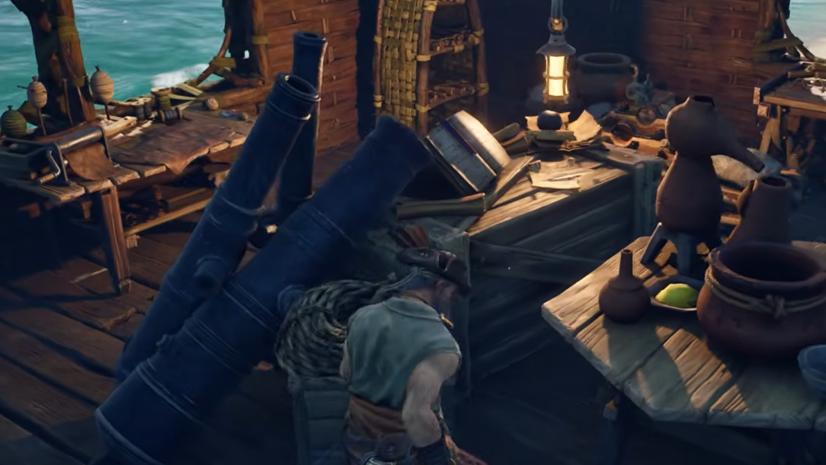 Once the cannons are mounted, you aim by holding right-click at the helm and fire with left-click. The front guns shoot on your command, and your crew handles the broadside cannons automatically once you line up a side-on angle with an enemy hull.