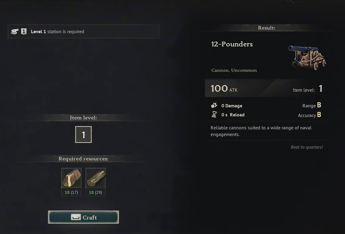 | 12-Pounder cannon | 10 Wood, 10 Copper Ingots each | Crafted at the Shipwright's Workshop |
