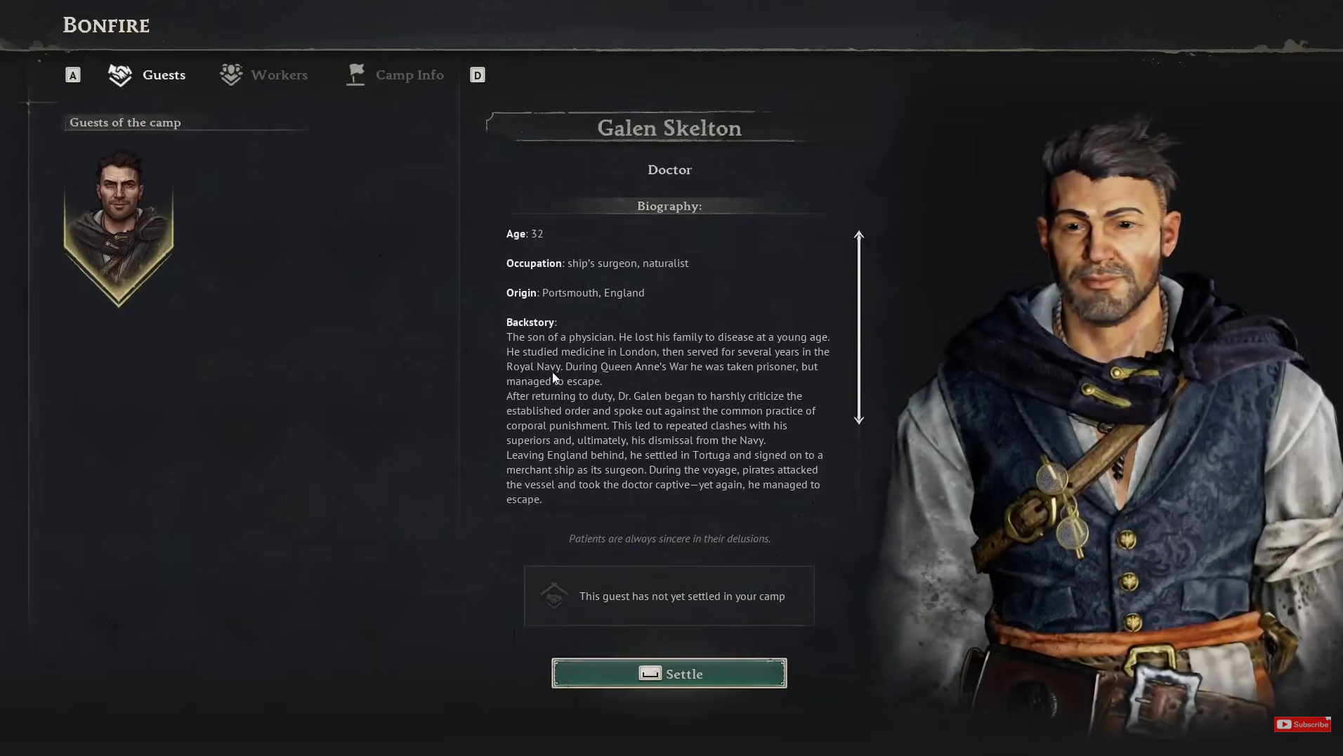 Step 3: Select Doctor Galen and choose Settle. He will spawn at the camp right away, usually standing near the fire, and any quest step that required talking to him should become actionable.
