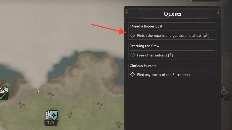 To make tracking easier, open your menu and set the I Need a Bigger Boat quest as your active tracked quest. This places markers on your map showing the repairable ship locations so you aren't wandering the island blind.