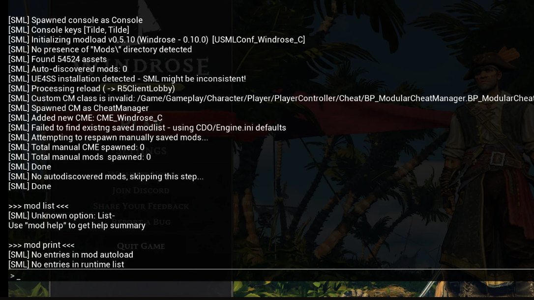 A Nexus Mods release called Simple Mod Loader (SML) re-enables the UE5 developer console on Windrose. It is a blueprint-based mod bootstrapper that installs into the game's Paks directory and hooks the console back on at runtime. Once installed, the tilde key opens a working prompt.