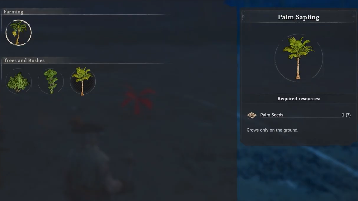 Step 2: Open the Build menu with B, go to the Farming tab, and place a Seedbed on flat ground at your base. Drop a Palm Sapling into any of the four slots.