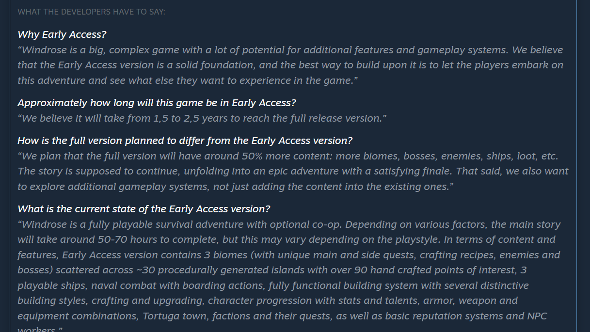 The shape of Windrose's Early Access plan comes from the Steam store page and the developer FAQ rather than a roadmap graphic. The studio is pointing to a multi-year window and a clear growth target, but it has deliberately avoided committing to specific dates for individual features or updates.