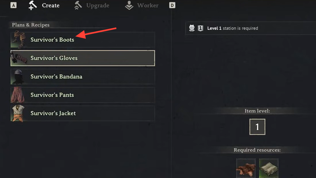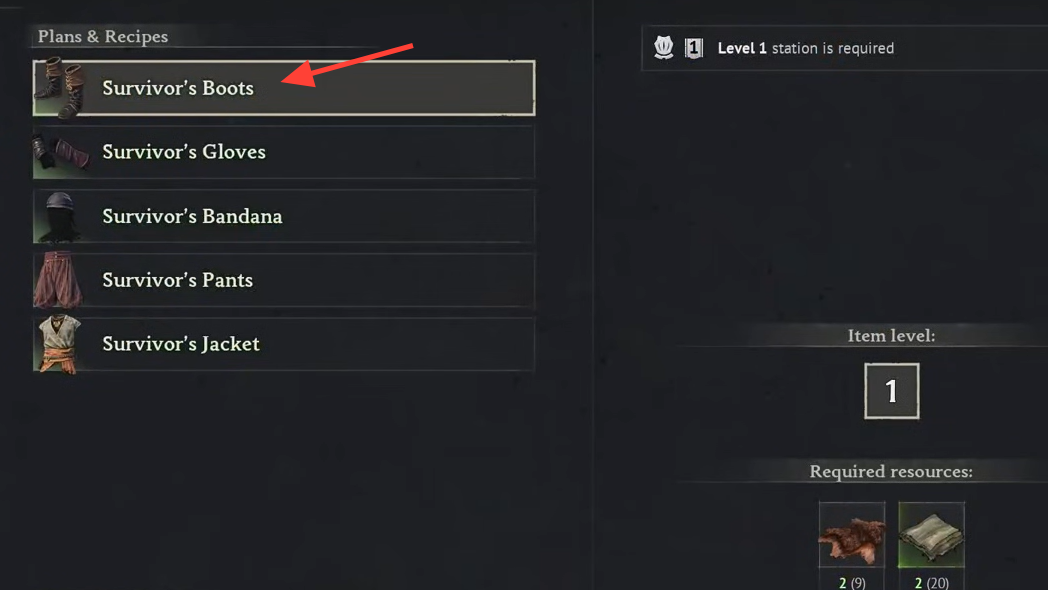Step 2: Select Survivor's Boots from the list. You'll need these materials in your inventory: