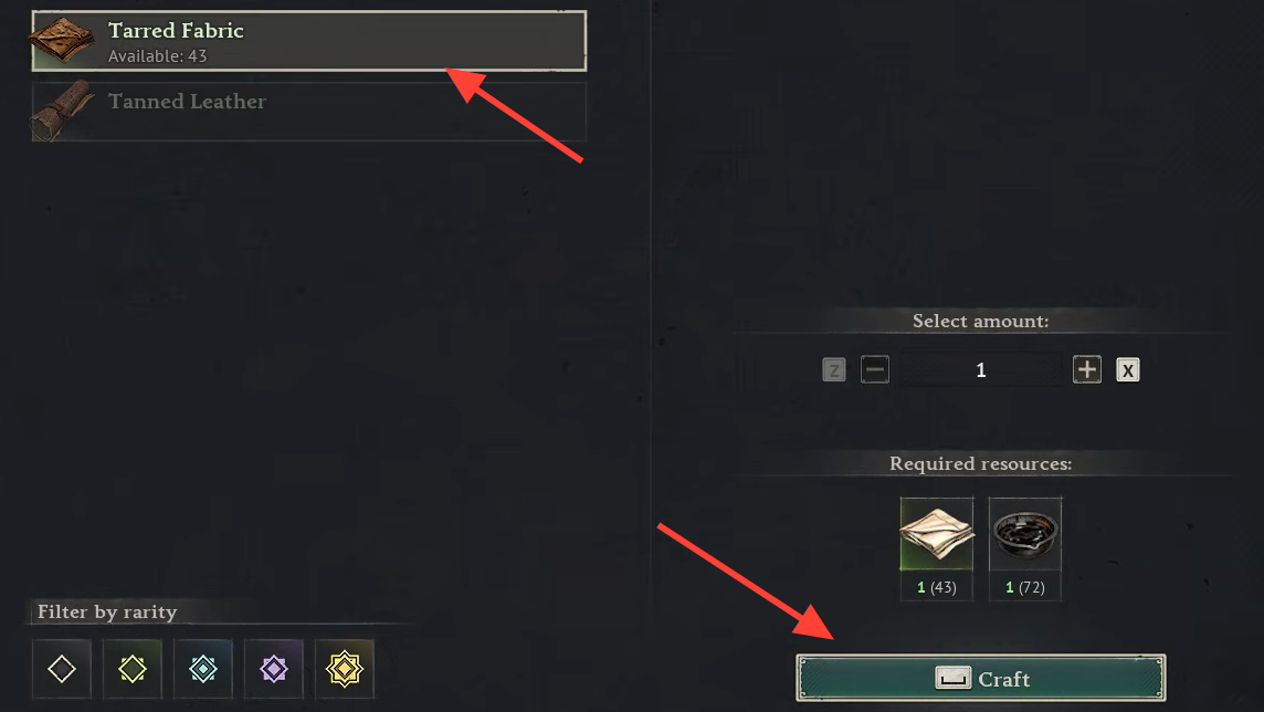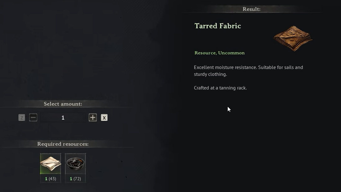 Step 2: Confirm the craft. The finished Tarred Fabric will appear in your inventory and can be used immediately in armor, clothing, and sail recipes that list it.