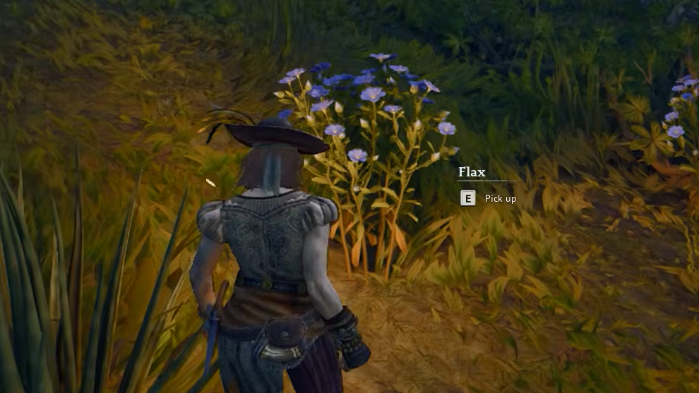 Step 1: Travel into the Foothills and sweep the terrain for blue-flowered Flax plants. They appear in good density along the southwestern stretch of the biome, so anchor your search there if you want to gather efficiently.