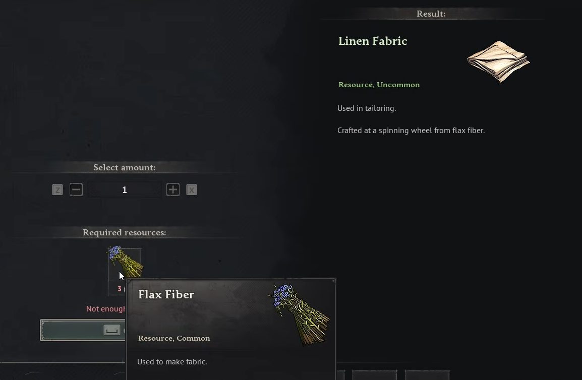 Step 3: Return to base and interact with a Spinning Wheel. Select the Linen Fabric recipe and convert your Flax Fiber into cloth. That finishes the first ingredient.
