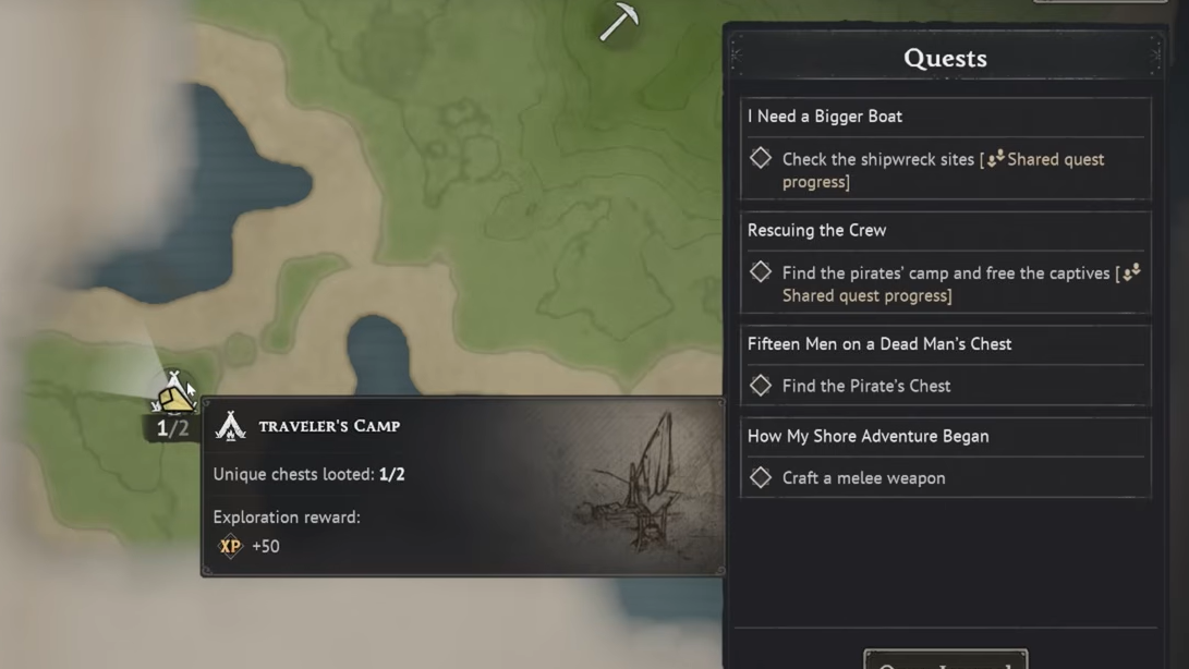 Traveler's Camp is a recurring point of interest across the archipelago, not a one-off on the tutorial island. Later camps follow the same layout: one visible chest by a tent, and one buried chest near a red-cloth tree within roughly twenty paces of the tent.
