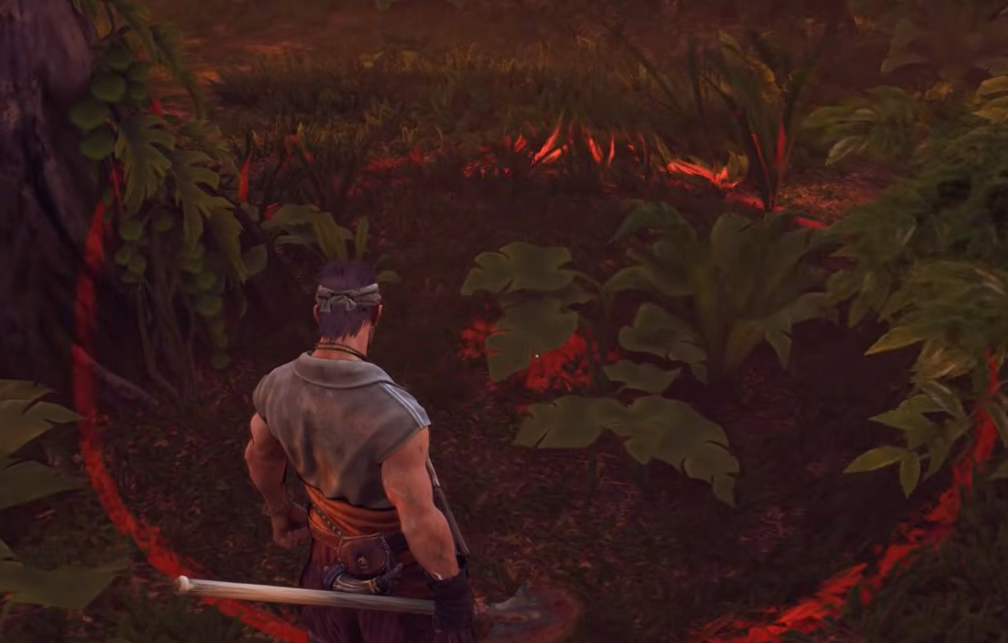 If the cloth is hard to see, light an oil lamp or skip time to daytime. The red fabric reads as almost pink against dark foliage once the light is up.