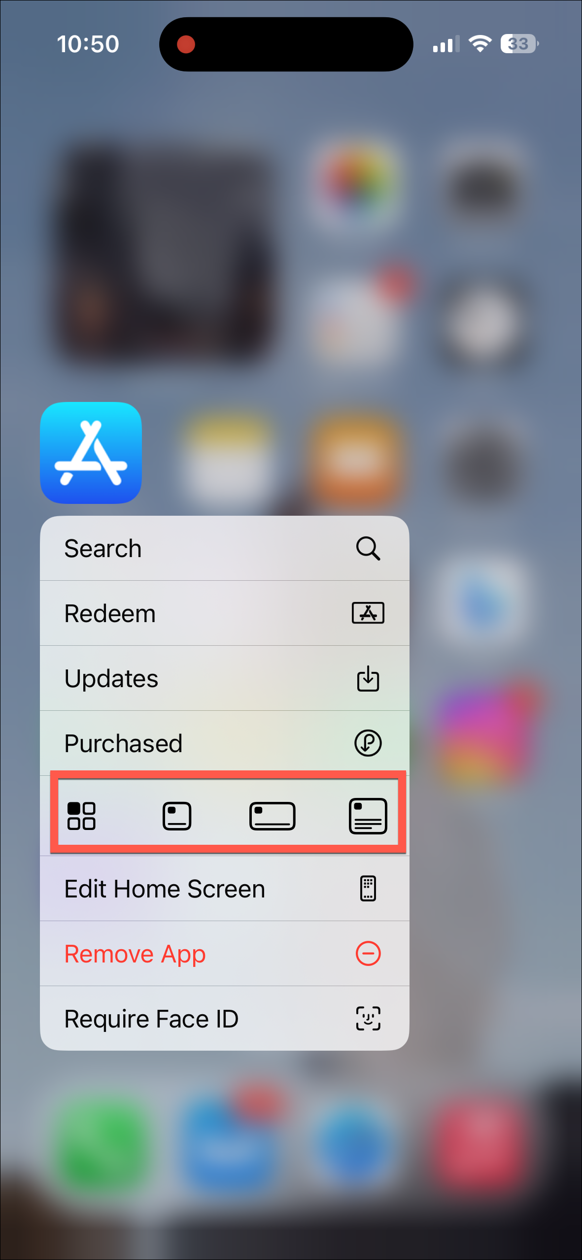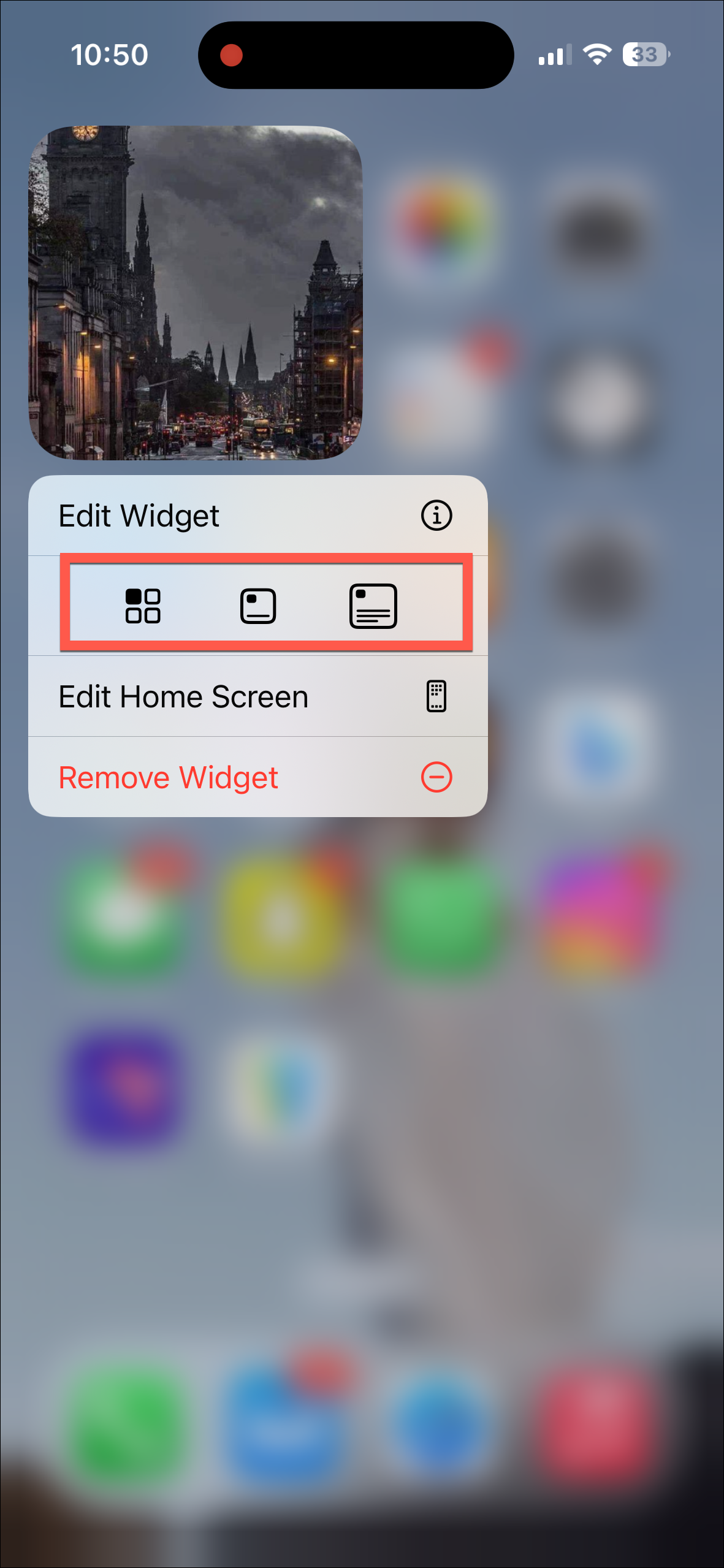 - You'll find a new row of options that wasn't there before. Select the widget size from the options. You can also change it to the app icon by selecting the first option (this option won't be available for widgets in Today View).