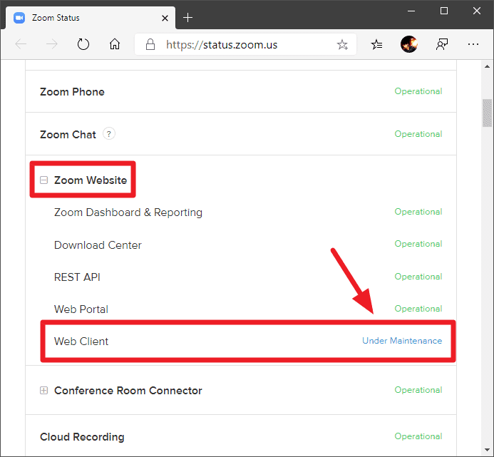 Generally, Zoom shows ‘403 Forbidden’ error when the service’ web client or portal is under maintenance. To verify, you can go to status.zoom.us website and check if any of the services like ‘Web Client’ or ‘Web Portal’ are under maintenance in the ‘Zoom Website’ section.