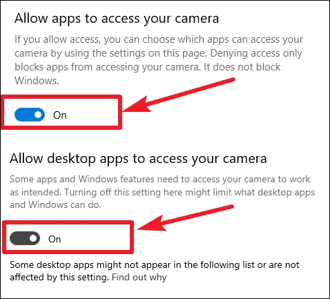 Confirm that Windows isn’t blocking access to the camera and also that Zoom and other apps have permission to access your camera. Open your privacy settings from the Windows settings, and go to ‘Camera’ permissions. Then make sure that toggle for the settings ‘Allow Apps to access your Camera’ and ‘Allow desktop apps to access your Camera’ is on. Turn it on if it isn’t.