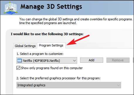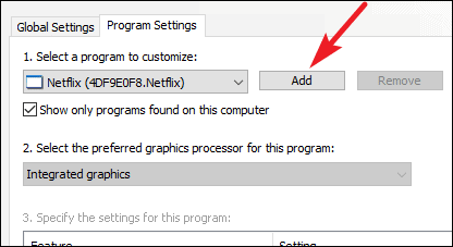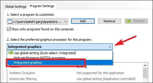 Now, click on the drop-down menu under ‘Select the preferred graphics processor for this program’ and select ‘Integrated Graphics’ from the list of options.