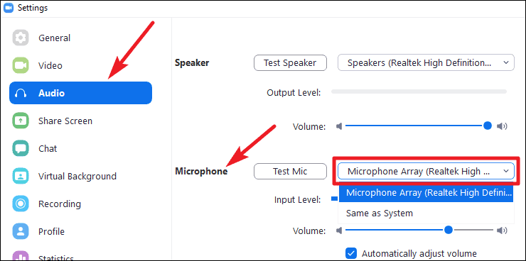 Confirm that Zoom is using the right microphone. This can be a problem if there is more than one microphone available in your system – physical or virtual. Go to ‘Audio’ settings from the Zoom settings, and check that the correct device is showing against the ‘Microphone’ option. Otherwise, change it from the drop-down menu.