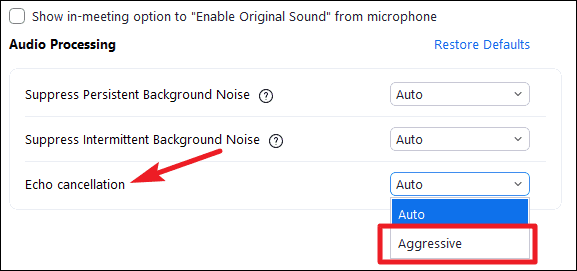 Now, click on the drop-down menu next to ‘Echo cancellation’ and select ‘Aggressive’ from the list of the options.