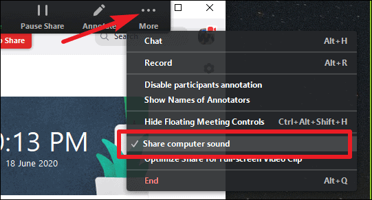 If the problem is that other participants in the meeting can’t hear the audio from your computer while screen sharing, it’s because you didn’t share your computer audio with them. Zoom needs you to explicitly share the audio. If you’re already sharing your screen, click on the ‘More’ option (three dots) on the meeting toolbar and select ‘Share computer sound’ from the menu.
