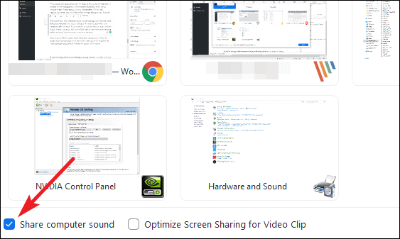 You can also enable this option before starting the sharing session. When the window to choose the screen you want to share opens, enable the checkbox for ‘Share computer sound’ from the bottom left corner of the window.