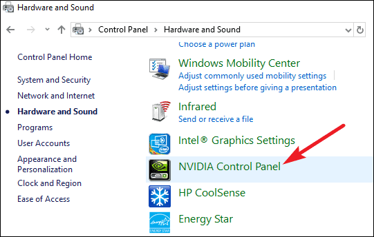 To solve this, open the Control Panel, go to ‘Hardware and Sound’ and open ‘NVIDIA Control Panel’.