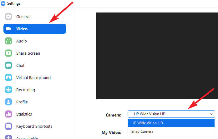 It is possible that Zoom might have the incorrect camera chosen and you can verify the same from Zoom settings. Go to ‘Video’ from Zoom settings and see that the listed webcam against the ‘Camera’ option is the correct one. If it isn’t, select the same from the drop-down menu.